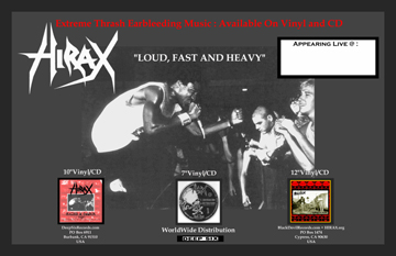 HIRAX, Phantasm, Transmetal (Mexico), Leprosy (Mexico), Anal Cunt, Nunslaughter, Abigail (Japan), Morbosidad, Thrash of the Titans comp, Videos, DVDs, cassettes and vinyl records, T-shirts, patches, buttons, posters and Stickers...more to come...